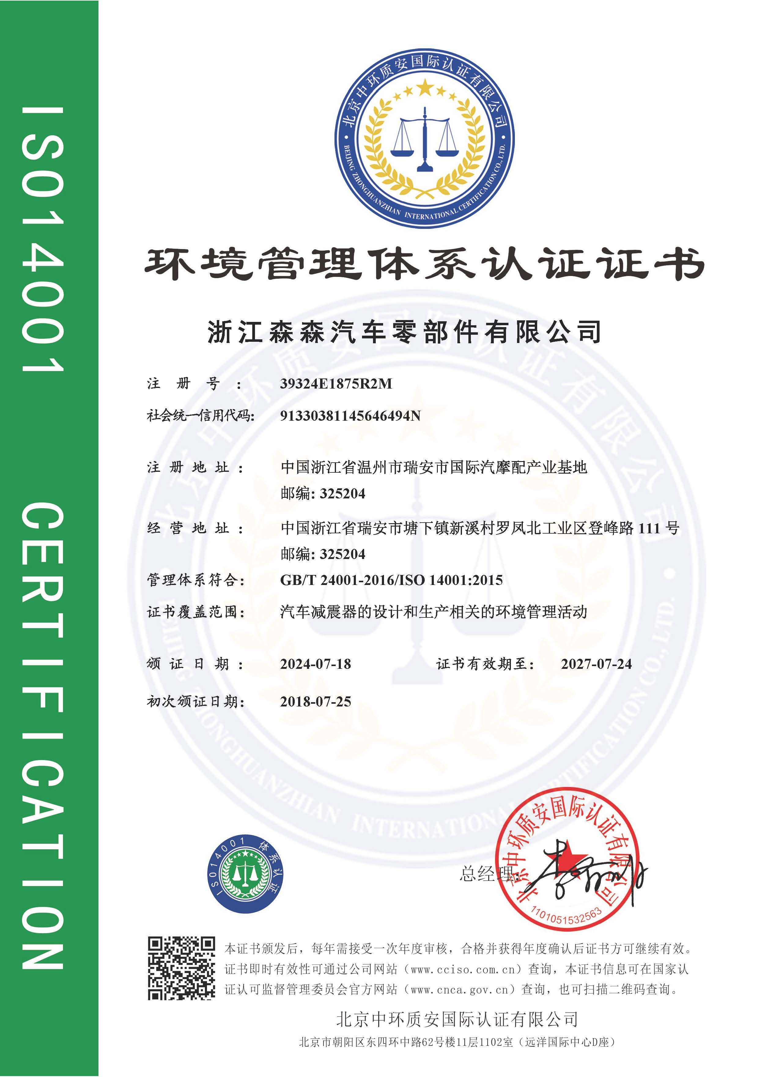 环境管理体系认证证书GB/T24001: 2016 idt ISO14001:2015