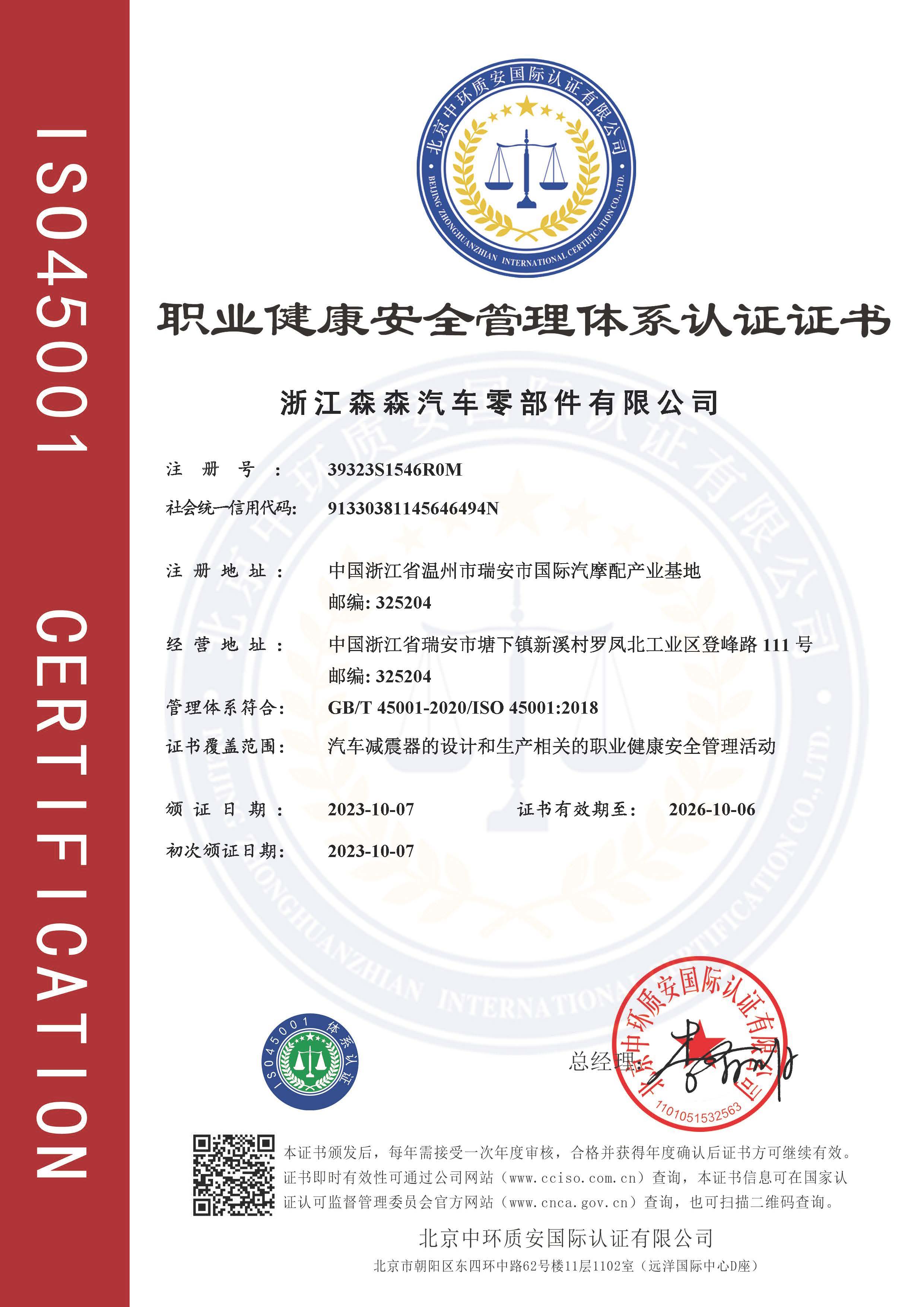 职业健康安全管理体系认证证书GB/T 45001-2020/S0 45001:2018